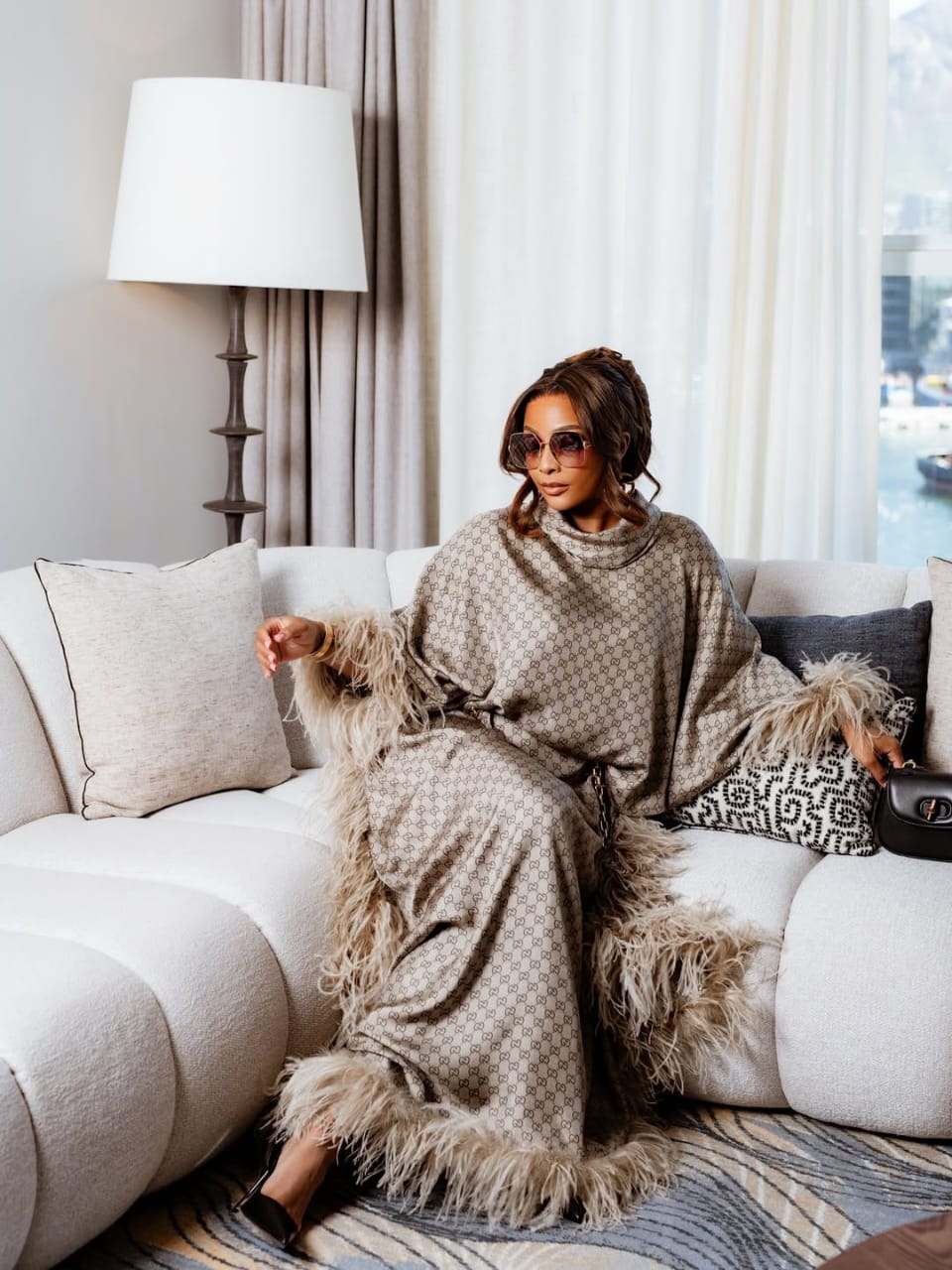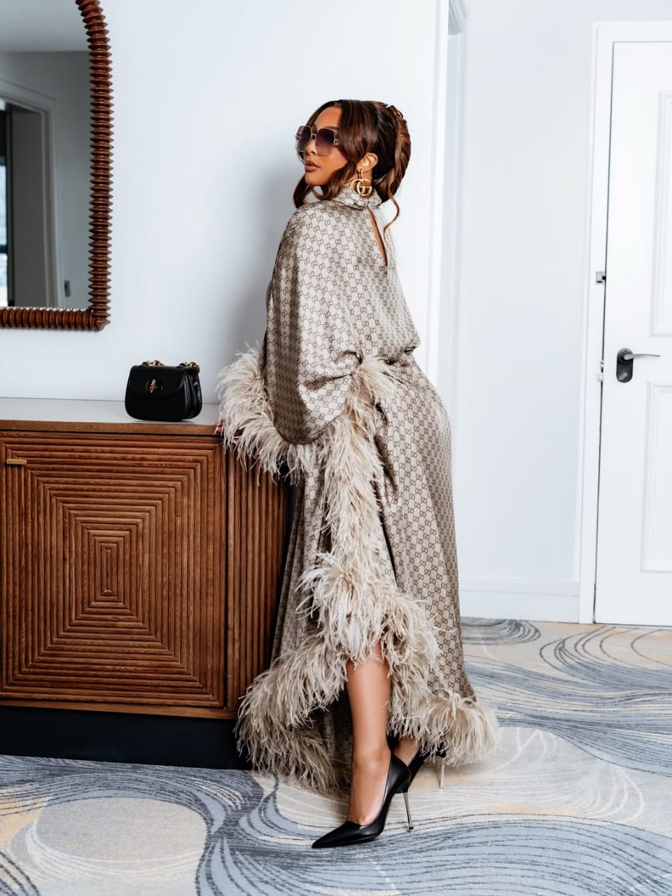 She wore a Gucci Primadona look in the house’s signature monogram, styled as a flowing, floor-length cut with feather-trimmed cuffs and hem. The high neckline and relaxed drape created structure without restricting movement, while the neutral colour scheme kept the focus on shape and texture. She paired the look with pointed black heels, oversized sunglasses and a compact top-handle bag, keeping accessories controlled and deliberate.
