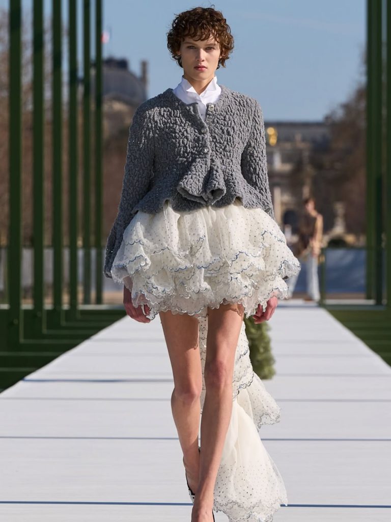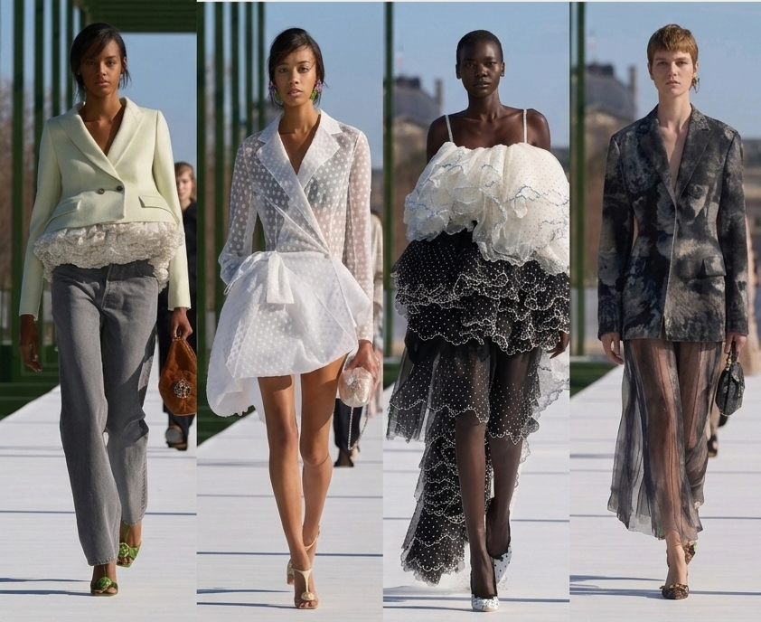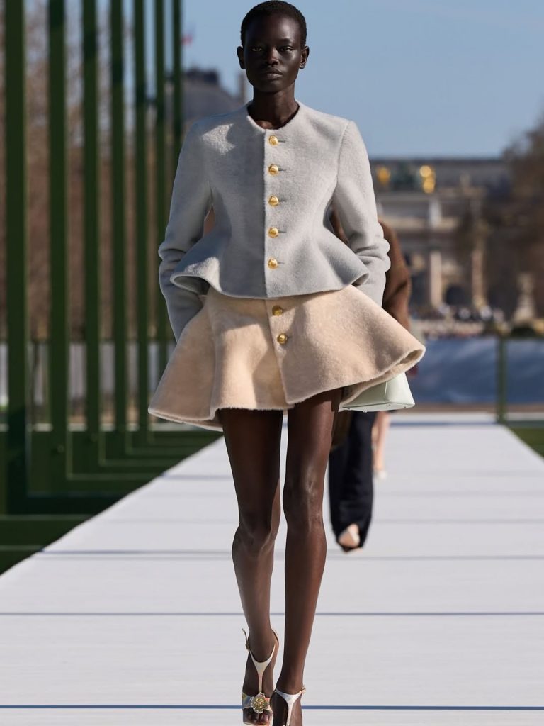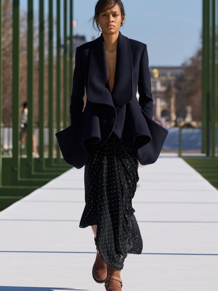 Tailoring also played an important role in the collection. The iconic Bar jacket, first introduced by Christian Dior, reappeared in updated interpretations. The silhouette was sometimes paired with softer pieces or styled in unexpected ways.