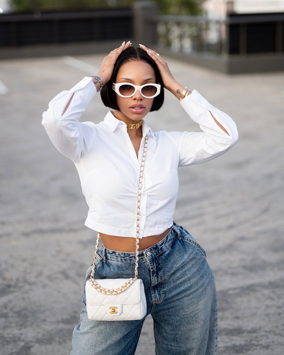 The look itself is simple and precise. A crisp white shirt, mid-wash jeans, white boots, minimal jewellery, and a compact quilted bag worn crossbody. None of these pieces depend on layering for impact. There is no visible effort to impress. Yet the outcome reads composed and assured.