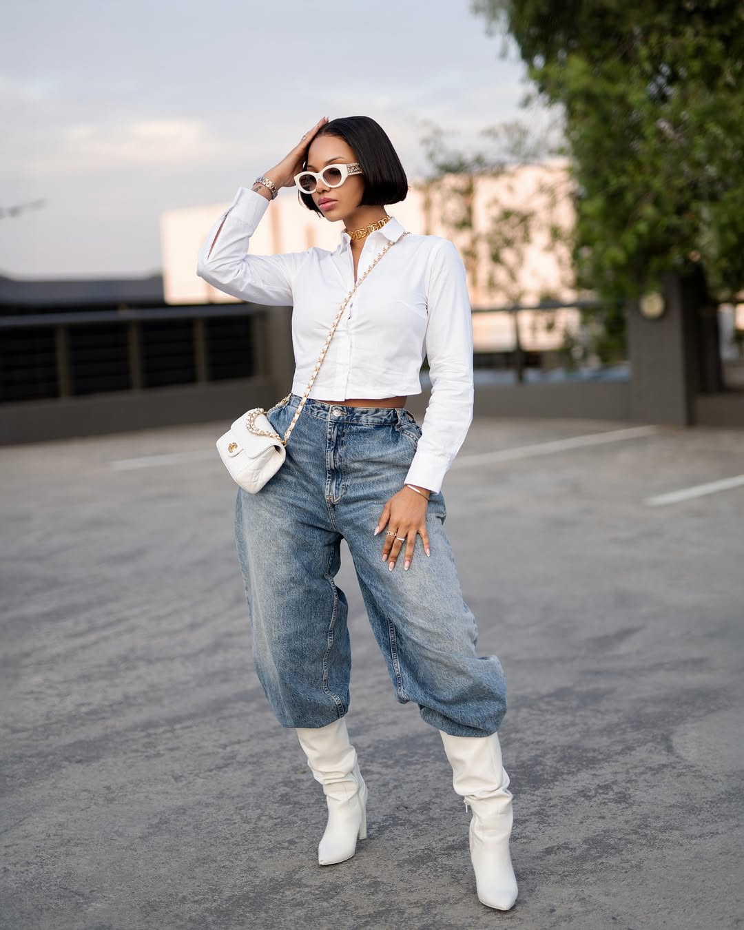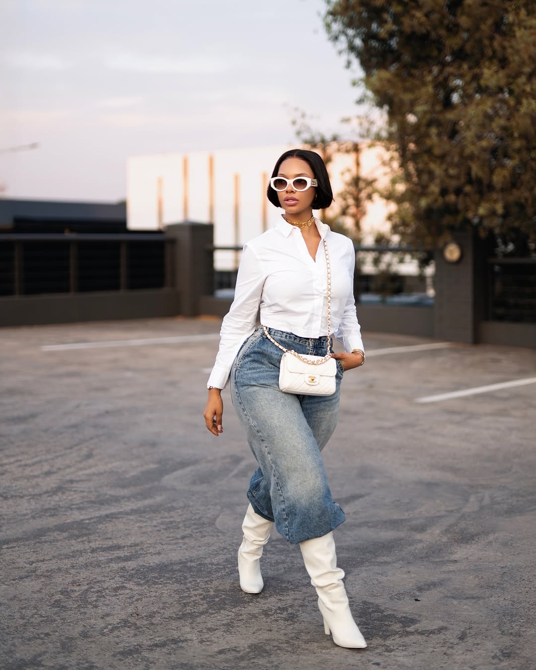 Equally important is how the clothes are worn. Mihlali approaches denim with the same assurance she brings to tailored or high-fashion pieces. That consistency matters. When casual clothing is worn without apology or exaggeration, it stops reading as casual. It becomes deliberate.
