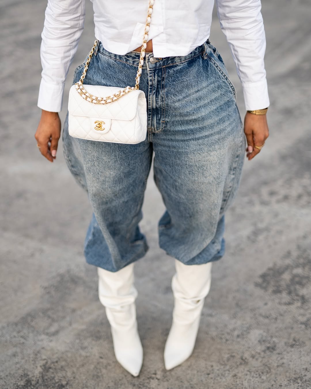 Accessories are kept deliberately small in scale. The bag remains understated, shifting the focus without altering the balance of the look. The boots follow the same logic. White, streamlined, and uninterrupted by unnecessary detail, they extend the line of the leg and ground the denim without softening it.