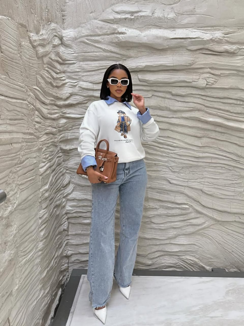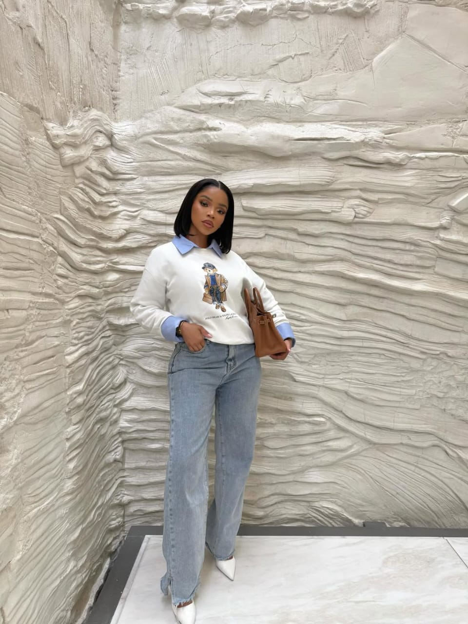 Nketsi pairs the hair with a cream sweatshirt featuring a graphic motif, layered over a pale blue shirt. The visible collar and cuffs add structure and contrast, breaking up the softness of the knit. Light-wash straight-leg denim keeps the outfit grounded, while pointed white heels sharpen the shape. A structured brown handbag completes the outfit, adding balance and intention to the colour scheme.
