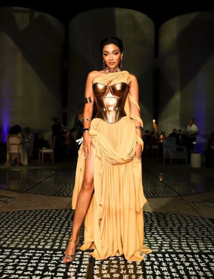 The looks focused on tailored shapes. Sculpted bodices, tailored suits, layered detailing, and close-fitting gowns appeared throughout the evening, with clear attention given to cut and fabric. Beading, raffia, metallic touches, and woven elements brought depth without overwhelming the wearer. Hair and beauty followed a similar path: braided details, natural textures, and shaped styles were paired with simple makeup that allowed comfort and wearability while staying in step with the clothing.