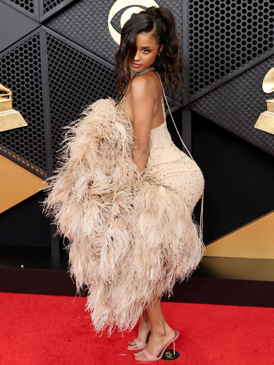 Photographers and fashion critics highlighted how Tyla’s gown combined delicate feathers with sparkling crystal accents, which caught the light on camera and added depth to her look. Unlike some attendees who opted for bright colors or heavily structured gowns, Tyla’s outfit focused on subtle detailing and layered textures, giving her a refined, distinctive presence on the red carpet.