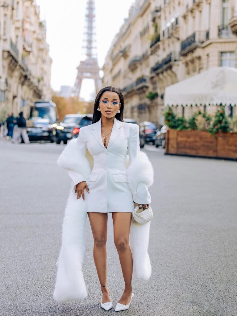South African content creator Happy Lethabo with a growing presence in fashion and lifestyle spaces is often seen in outfits that align with a preference for strong tailoring and minimal detailing. Her choices tend to prioritise fit and shape over added detail. In Paris, that approach comes through clearly in a white look that looks contemporary.