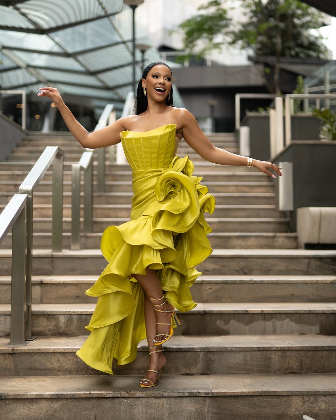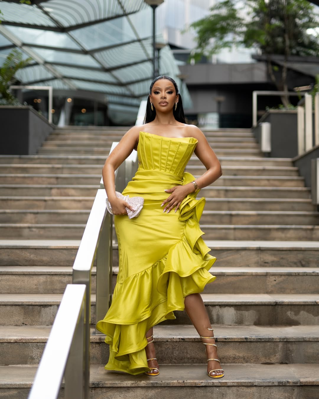What makes the look work is control. Despite its dramatic details, the outfit never feels overdone. The clean neckline offsets the weight of the draping, the corsetry anchors the structure of the skirt, and the accessories remain intentional rather than decorative. Ndamase carries the look with ease, moving between composed and playful poses that prevent it from feeling static. The result is a fashion-forward image suited to a magazine spread and consistent with the direction her recent style choices suggest.