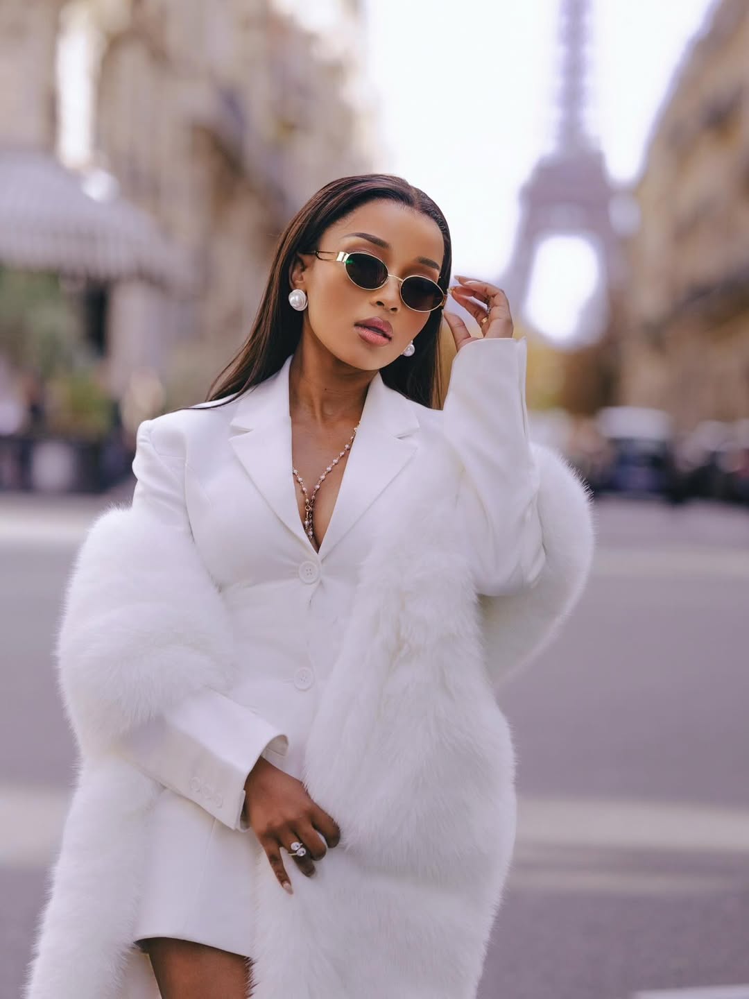 At the heart of the look is a sharply tailored white blazer dress, cut close at the waist with structured lapels that give shape and authority to the form. Over her shoulders, she draped a long white faux-fur coat, adding texture and subtle flow to the ensemble. The combination of precise tailoring and soft material creates balance, keeping the outfit visually interesting while maintaining simplicity. She wore pointed white heels, a compact textured clutch, delicate pearl stud earrings, a fine necklace, and slim sunglasses, each piece carefully chosen to support the overall style.