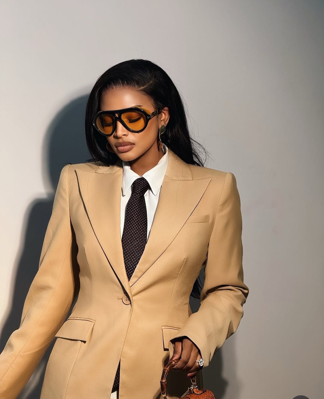 Who said power dressing has to be boring, Ayanda took the classic blazer and turned it into something far more interesting with this light beige. The oversized cut gives it that effortless cool factor, while the cinched waist keeps things polished. That pop of burgundy from the tie is a genius move.