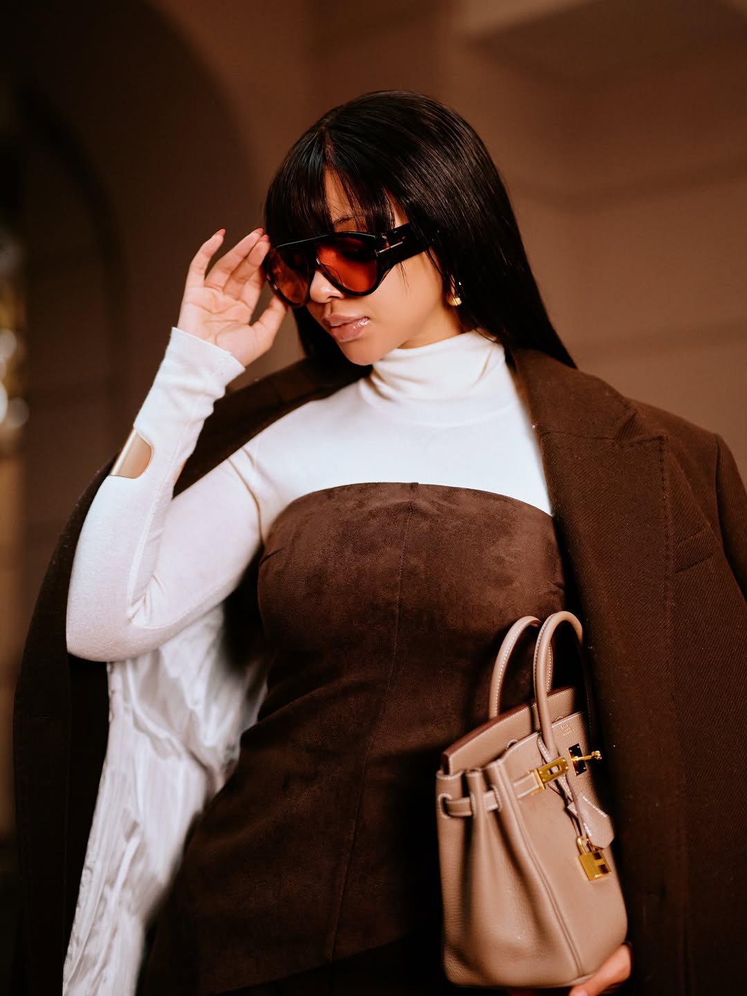 She keeps accessories minimal. Sunglasses show up across the images, sometimes worn, sometimes in hand, adding just enough variation without pulling focus from the outfit itself.