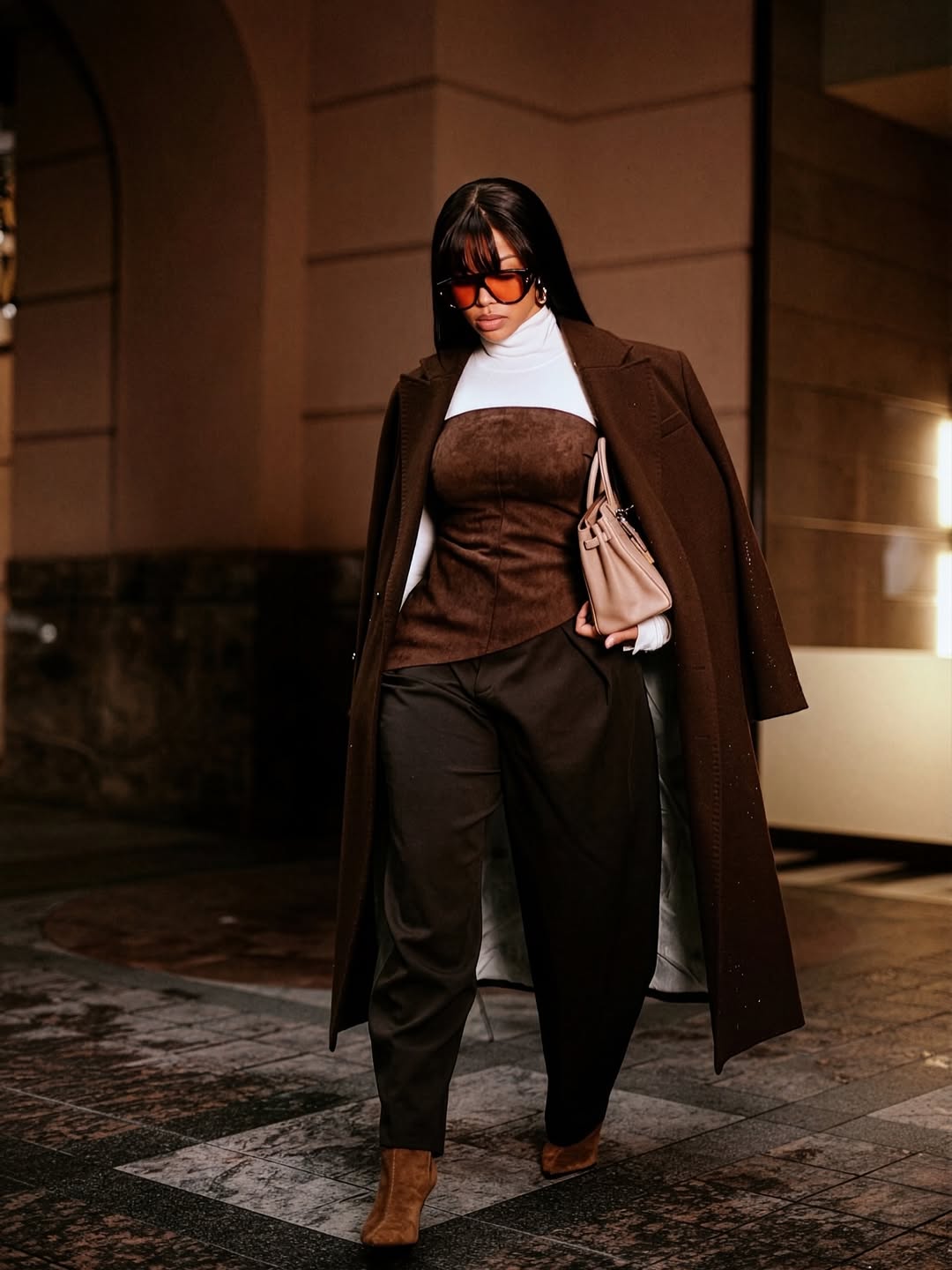 Accessories remain minimal and deliberate. The handbag is compact and structured. The sunglasses complete the outfit and reinforce its direction, reducing facial emphasis and sharpening the overall appearance.