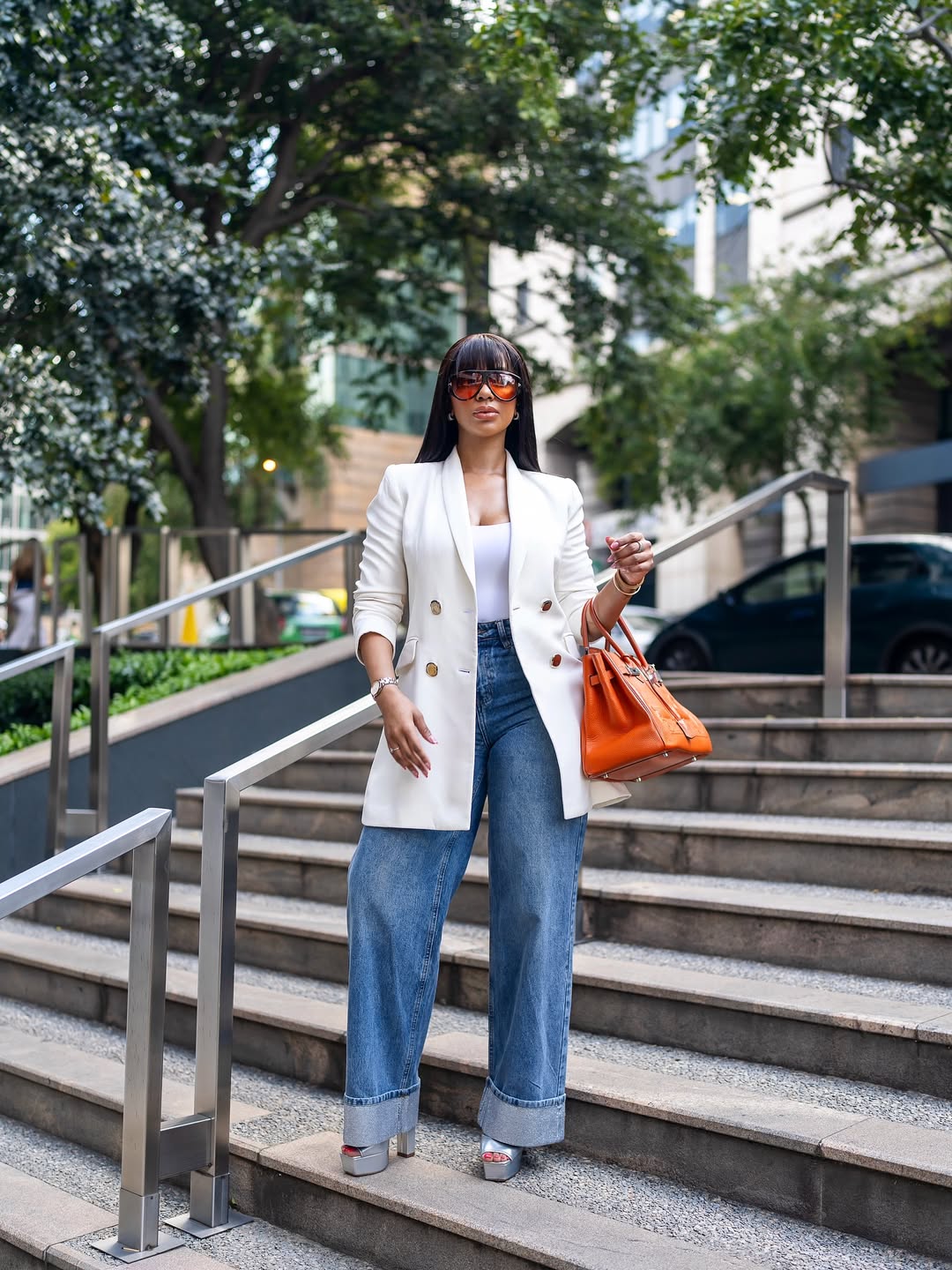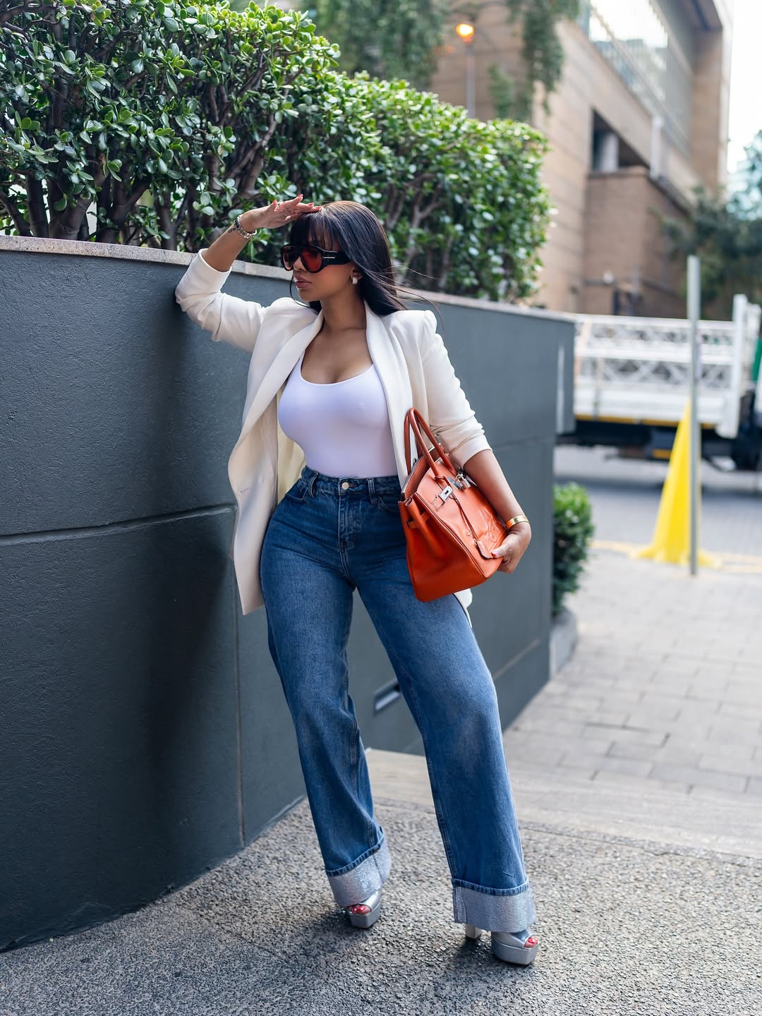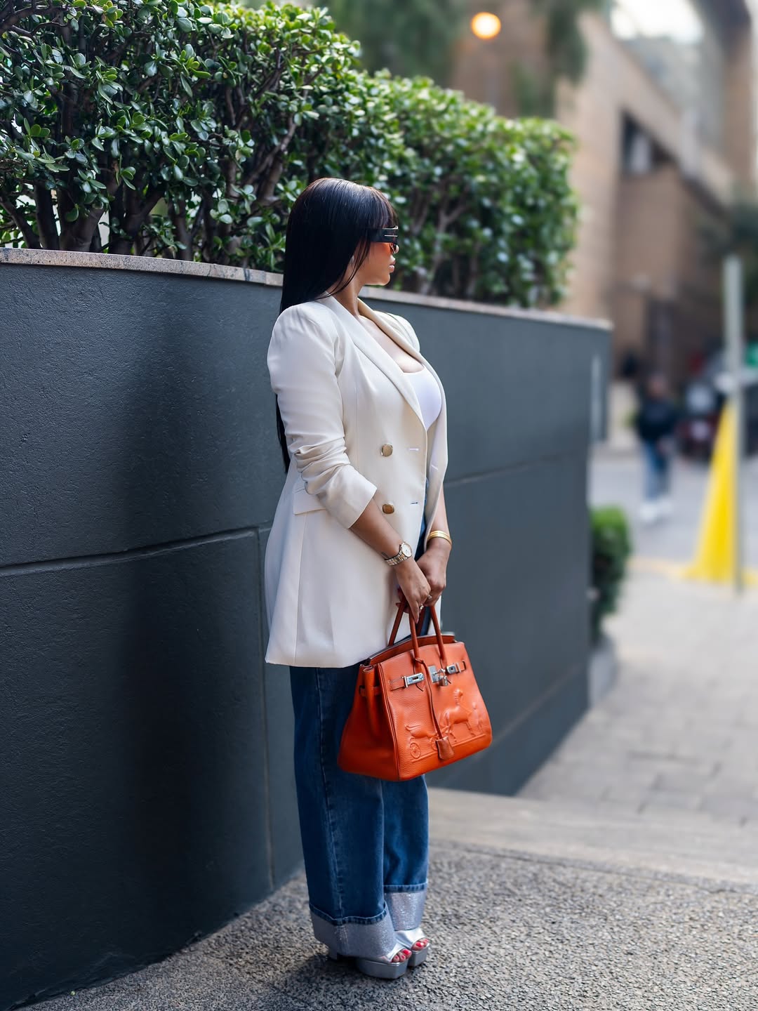 Mihlali Ndamase has built a style direction defined by bold colour and body-conscious shapes. Recently, her Instagram feed has focused on figure-hugging dresses from her label, Treasury. But in a different direction, she steps away from that approach, choosing instead a blazer and wide-leg denim styled with a vintage reference.