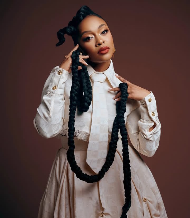 Nomzamo’s hair is arranged high on her head, gathered tightly so her face is open and clear. The braids rise upward, bending into big round shapes that stand tall above her. Each round piece connects smoothly, almost like rings made out of hair. The height and shape give her the look of wearing a tall crown made from braids. It feels grand but still natural, showing both beauty and confidence.
