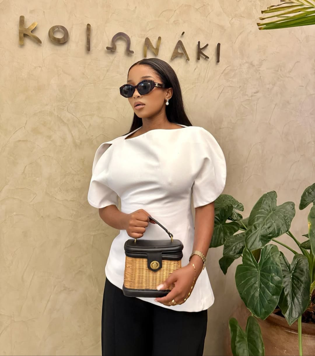 South African influencer Thabee Happy Lethabo appears in a series of photos taken outside Kolonaki, wearing a minimalist outfit built around a black-and-white combination. The look centres on structured clothing and restrained accessories.