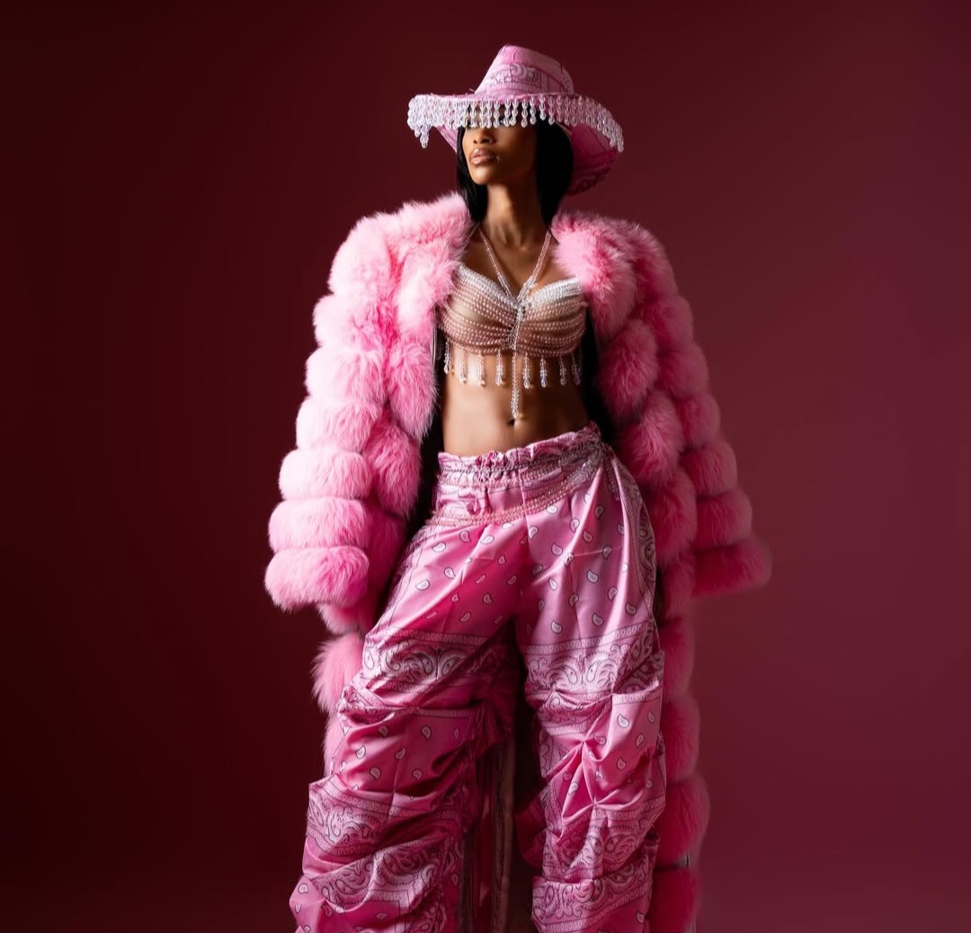 Her outfit included oversized cargo pants made from pink bandana fabric. The baggy fit gave the pants a streetwear feel while the bright pattern made them stand out. She paired them with a beaded crop top in a light blush shade, designed with crystal tassels that added movement to the outfit. Going into even more drama, she wore a long faux fur coat in hot pink. The coat was layered and heavy, giving the outfit structure and making the whole look feel bigger and more powerful.