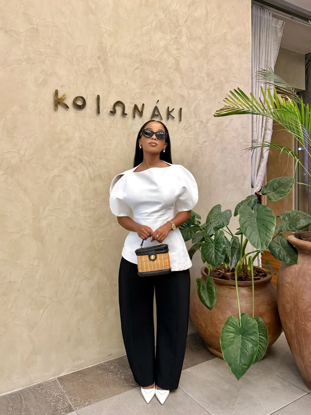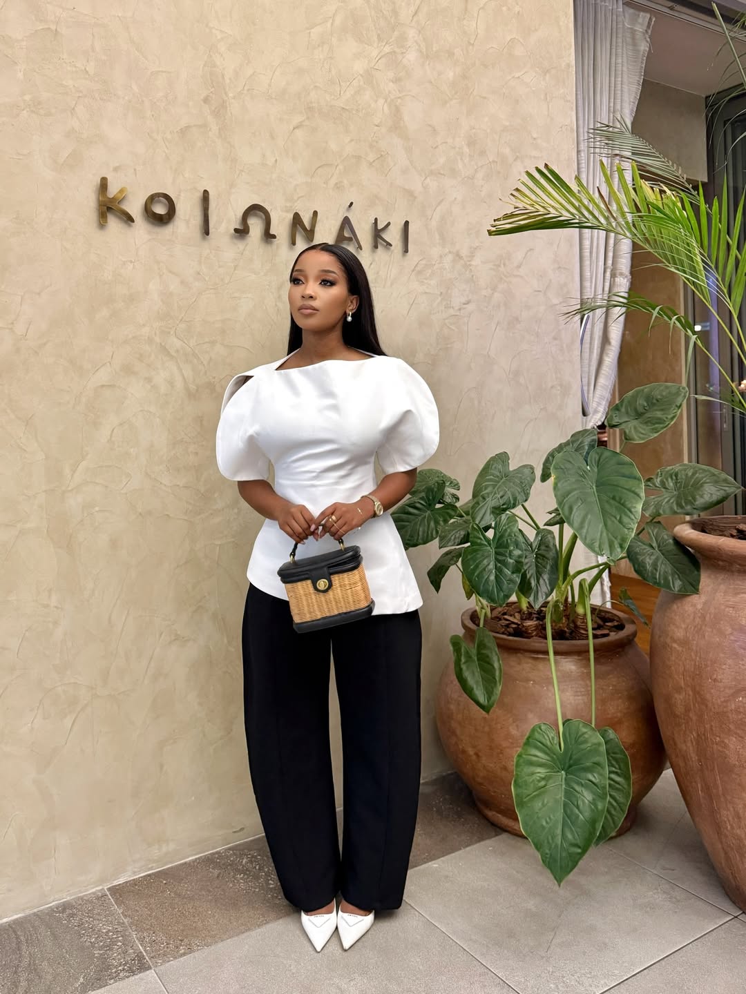 South African influencer Thabee Happy Lethabo appears in a series of photos taken outside Kolonaki, wearing a minimalist outfit built around a black-and-white combination. The look centres on structured clothing and restrained accessories.